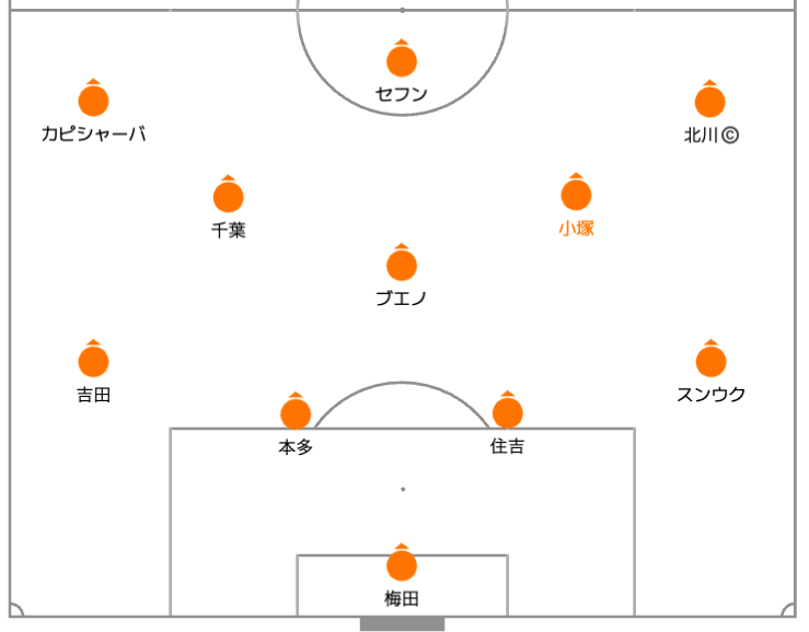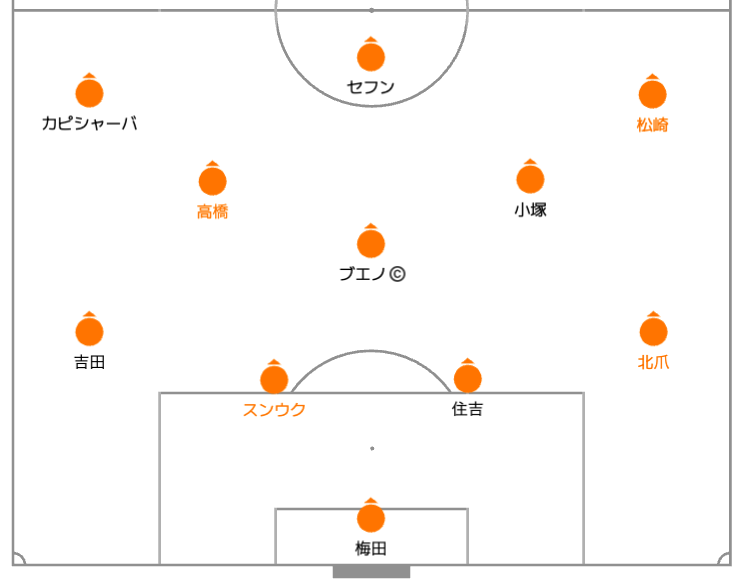 疲労の見えた千葉・北川と直前で負傷した本多を下げ、高橋、松崎と北爪を投入。右サイドの活性化と運動量回復を狙った交代でした。